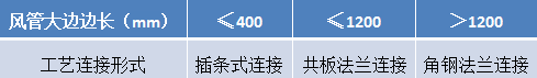 根據(jù)施工現(xiàn)場具體情況,采用角鋼法蘭、共板法蘭和插條式連接三種工藝連接或者聯(lián)合使用。工藝及風管邊長劃分、風管鋼板厚度如下: