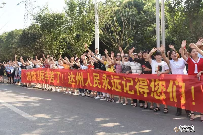 火災(zāi)成功撲救后,在撤離現(xiàn)場,達(dá)州市民自發(fā)到街道兩側(cè),拉起“消防官兵,你們辛苦了!”“感激有你們”等大大小小的橫幅,向消防官兵致敬和送行。