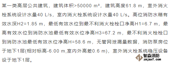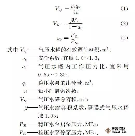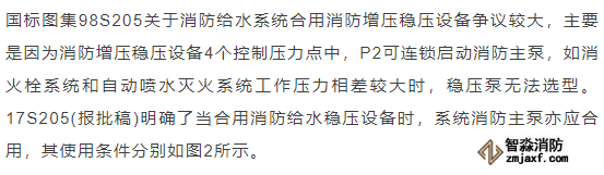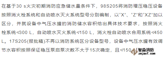 臨時(shí)高壓消防給水系統(tǒng)一般均應(yīng)設(shè)置高位消防水箱(除符合規(guī)范規(guī)定可不設(shè)的情形外),且對(duì)其設(shè)置高度有一定要求。日本規(guī)范規(guī)定自動(dòng)噴水滅火系統(tǒng)屋頂消防水箱最不利的最低供水壓力為0.15 MPa,美國、英國規(guī)范則要求0.10 MPa。我國1987年版和2006年版“建規(guī)”對(duì)比均沒有規(guī)定,只在條文中要求重力自流的消防水箱應(yīng)設(shè)置在建筑的最高部位。1982年版《高層民用建筑設(shè)計(jì)規(guī)范》(以下簡稱“高規(guī)”)首次提出屋頂消防水箱應(yīng)滿足最不利消火栓的靜水壓力,但沒有提出設(shè)計(jì)參數(shù),1995年版“高規(guī)”做了具體規(guī)定。國標(biāo)圖集98S205編制目的是為解決臨時(shí)高壓消防給水系統(tǒng)高位消防水箱設(shè)置高度滿足不了系統(tǒng)最不利點(diǎn)靜水壓力時(shí)應(yīng)設(shè)增壓設(shè)施的要求,其為消防專用的增壓穩(wěn)壓設(shè)備的主要功能只是火災(zāi)初期時(shí)、消防主泵啟動(dòng)前,確保具有足夠消防壓力的30 s儲(chǔ)水量進(jìn)行初期火災(zāi)撲救,直至消防主泵全負(fù)荷啟動(dòng)運(yùn)行。這里更多的還是強(qiáng)調(diào)增壓的概念,設(shè)備類似于氣壓供水,發(fā)揮主要作用的是氣壓水罐,穩(wěn)壓水泵的作用是在3 min內(nèi),補(bǔ)足氣壓水罐內(nèi)實(shí)際穩(wěn)壓水容積。利用氣壓水罐所設(shè)定的P1、P2、PS1和PS2運(yùn)行壓力來控制穩(wěn)壓泵運(yùn)行工況。P1為根據(jù)計(jì)算求得消火栓系統(tǒng)或自動(dòng)噴水滅火系統(tǒng)中最不利點(diǎn)所需的消防壓力作為氣壓水罐的充氣壓力。平時(shí)管道系統(tǒng)如有滲漏泄壓等情況,控制穩(wěn)壓水泵不斷補(bǔ)水穩(wěn)壓,在PS1、PS2(啟動(dòng)-停止)反復(fù)運(yùn)行,一旦有火情,管道系統(tǒng)大量缺水,造成PS1下降(PS1→P2),降至P2時(shí),立即啟動(dòng)消防主泵。