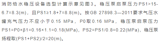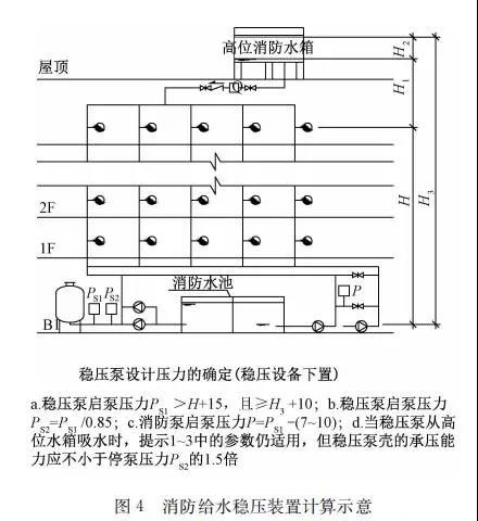 臨時高壓消防給水系統(tǒng)一般均應(yīng)設(shè)置高位消防水箱(除符合規(guī)范規(guī)定可不設(shè)的情形外),且對其設(shè)置高度有一定要求。日本規(guī)范規(guī)定自動噴水滅火系統(tǒng)屋頂消防水箱最不利的最低供水壓力為0.15 MPa,美國、英國規(guī)范則要求0.10 MPa。我國1987年版和2006年版“建規(guī)”對比均沒有規(guī)定,只在條文中要求重力自流的消防水箱應(yīng)設(shè)置在建筑的最高部位。1982年版《高層民用建筑設(shè)計規(guī)范》(以下簡稱“高規(guī)”)首次提出屋頂消防水箱應(yīng)滿足最不利消火栓的靜水壓力,但沒有提出設(shè)計參數(shù),1995年版“高規(guī)”做了具體規(guī)定。國標圖集98S205編制目的是為解決臨時高壓消防給水系統(tǒng)高位消防水箱設(shè)置高度滿足不了系統(tǒng)最不利點靜水壓力時應(yīng)設(shè)增壓設(shè)施的要求,其為消防專用的增壓穩(wěn)壓設(shè)備的主要功能只是火災(zāi)初期時、消防主泵啟動前,確保具有足夠消防壓力的30 s儲水量進行初期火災(zāi)撲救,直至消防主泵全負荷啟動運行。這里更多的還是強調(diào)增壓的概念,設(shè)備類似于氣壓供水,發(fā)揮主要作用的是氣壓水罐,穩(wěn)壓水泵的作用是在3 min內(nèi),補足氣壓水罐內(nèi)實際穩(wěn)壓水容積。利用氣壓水罐所設(shè)定的P1、P2、PS1和PS2運行壓力來控制穩(wěn)壓泵運行工況。P1為根據(jù)計算求得消火栓系統(tǒng)或自動噴水滅火系統(tǒng)中最不利點所需的消防壓力作為氣壓水罐的充氣壓力。平時管道系統(tǒng)如有滲漏泄壓等情況,控制穩(wěn)壓水泵不斷補水穩(wěn)壓,在PS1、PS2(啟動-停止)反復(fù)運行,一旦有火情,管道系統(tǒng)大量缺水,造成PS1下降(PS1→P2),降至P2時,立即啟動消防主泵。