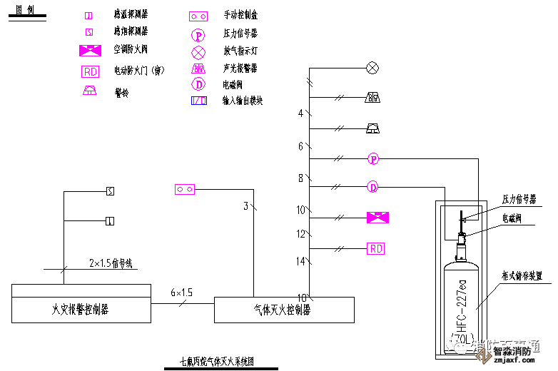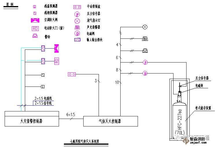 下面簡述一下該氣體滅火系統(tǒng)的組成方式,即參照《火災自動報警系統(tǒng)設(shè)計規(guī)范》GB50116-2013第4.4.3條,氣體滅火控制器、泡沫滅火控制器不直接連接火災探測器的組成方式,火災報警控制器設(shè)置在消防監(jiān)控中心,防護區(qū)設(shè)置的感煙探測器和感溫探測器直接連接到消防控制中心的集中報警控制器上,消防控制中心的火災報警控制器通過總線控制模塊聯(lián)動切除空調(diào)系統(tǒng)和防火閥,關(guān)閉防火卷簾門等;氣體滅火控制器設(shè)置在防護區(qū)的鋼瓶組附近,連接防護區(qū)內(nèi)的聲光報警器和防護區(qū)外的聲光報警器、以及啟動鋼瓶的電磁閥和氣體釋放的壓力開關(guān)信號機放氣指示門燈,現(xiàn)場緊急釋放和啟停按鈕設(shè)置在防護區(qū)門口。
