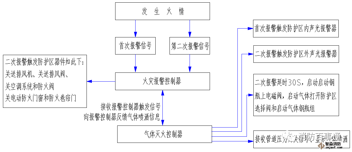 首先觸發(fā)信號防護區(qū)域內(nèi)任一設(shè)置的感煙火災探測器作為首個聯(lián)動觸發(fā)信號后,火災報警控制器接收到第一報警信號,同時氣體滅火控制盤接到火災報警控制器的聯(lián)動請求,啟動設(shè)置在該防護區(qū)內(nèi)的火災聲光警報器;再觸發(fā)感溫探測器或手動火災報警按鈕的報警信號,火災報警控制器接收到第二個報警信號,聯(lián)動該防護區(qū)內(nèi)的相關(guān)設(shè)備如:停止排風機、關(guān)閉排風閥、關(guān)閉空調(diào)電源和送風管道上的防火閥,關(guān)閉防火門窗和降下防火卷簾門;同時氣體滅火控制盤接到火災報警控制器的第二次聯(lián)動請求,啟動設(shè)置在該防護區(qū)外的火災聲光警報器;延時30秒后,開啟氣體啟動鋼瓶上的電磁閥,啟動氣體通過傳動管開啟相關(guān)區(qū)域的選擇閥和打開對應的FM200鋼瓶組,氣體噴灑到該保護區(qū)域,氣體傳送管道上的壓力開關(guān)有回答信號,同樣保護區(qū)外的“放氣勿入”指示燈點亮;氣體釋放的信息反饋到火災報警控制器上。