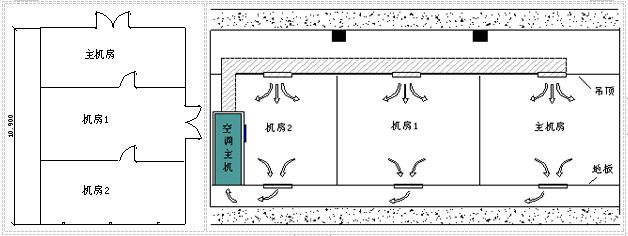 如下圖所示,若三個房間從吊頂?shù)降匕宥疾捎锚毩⒌目照{(diào)系統(tǒng),那么將機房1和機房2劃作一個區(qū)域或劃為兩個單獨滅火區(qū)都是可行的。但如果采用一臺精密空調(diào)為三個房間服務(wù)且為“上送風,地板下回風”方式這三個房間就必須劃分成一個滅火區(qū)域,藥劑儲備應(yīng)該是上者的3倍或1.5倍,對工程的投資影響是比較大的。除過滅火劑和噴放管道布置要作為一個保護區(qū)考慮外,探測范圍也應(yīng)該分塊進行探測但還是一個探測區(qū)域,警報區(qū)域也應(yīng)該按照一個區(qū)域來設(shè)置和聯(lián)動。
